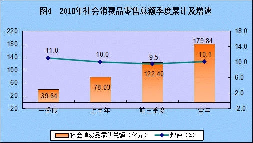 全年实现社会消费品零售总额179.84亿元,同比增长10.1%;批发业销售额521.46亿元,同比增长5.1%;零售业销售额179.19亿元,同比增长13.9%;住宿业营业额4.09亿元,同比增长12.4%;餐饮业营业额41.42亿元,同比增长14.9%。