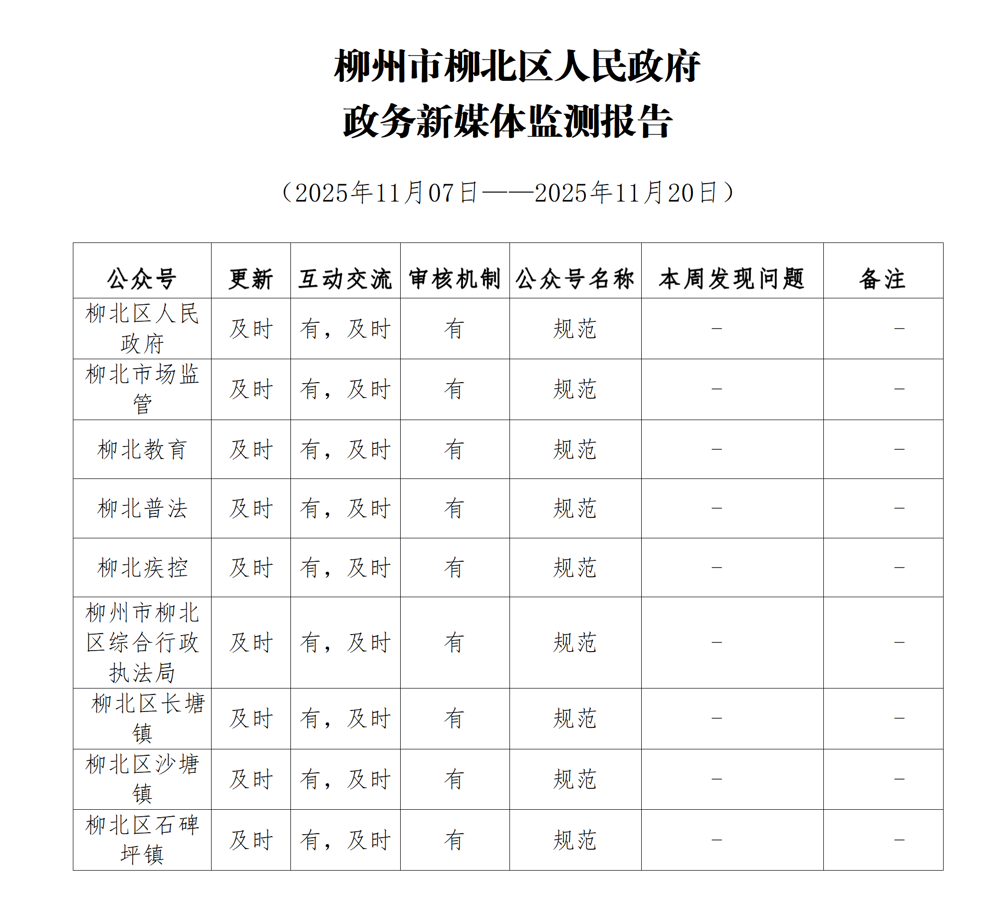 柳州市柳北区2025年11月份政务新媒体周监测情况