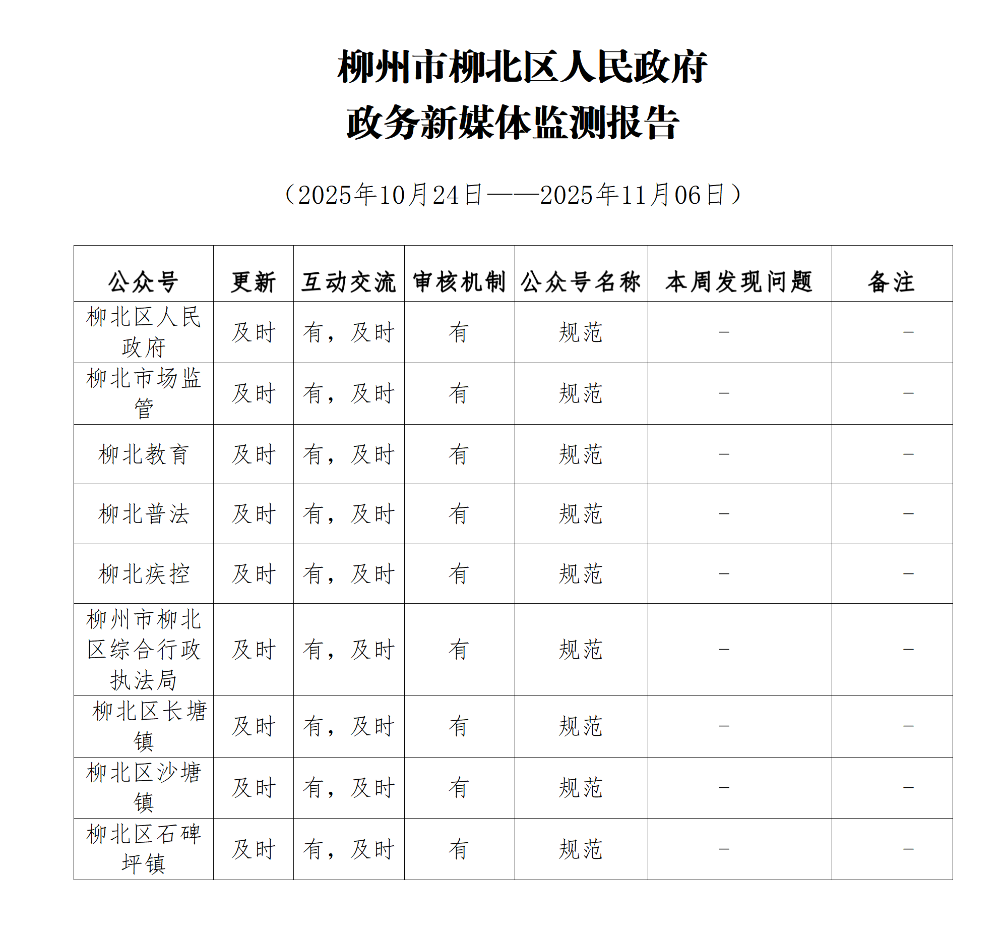 柳州市柳北区2025年11月份政务新媒体周监测情况