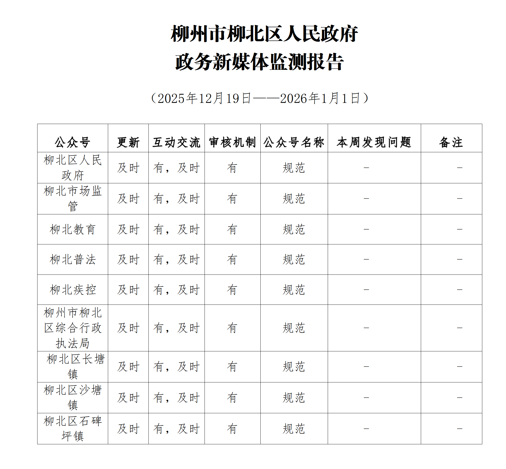 柳州市柳北区2025年12月份政务新媒体周监测情况