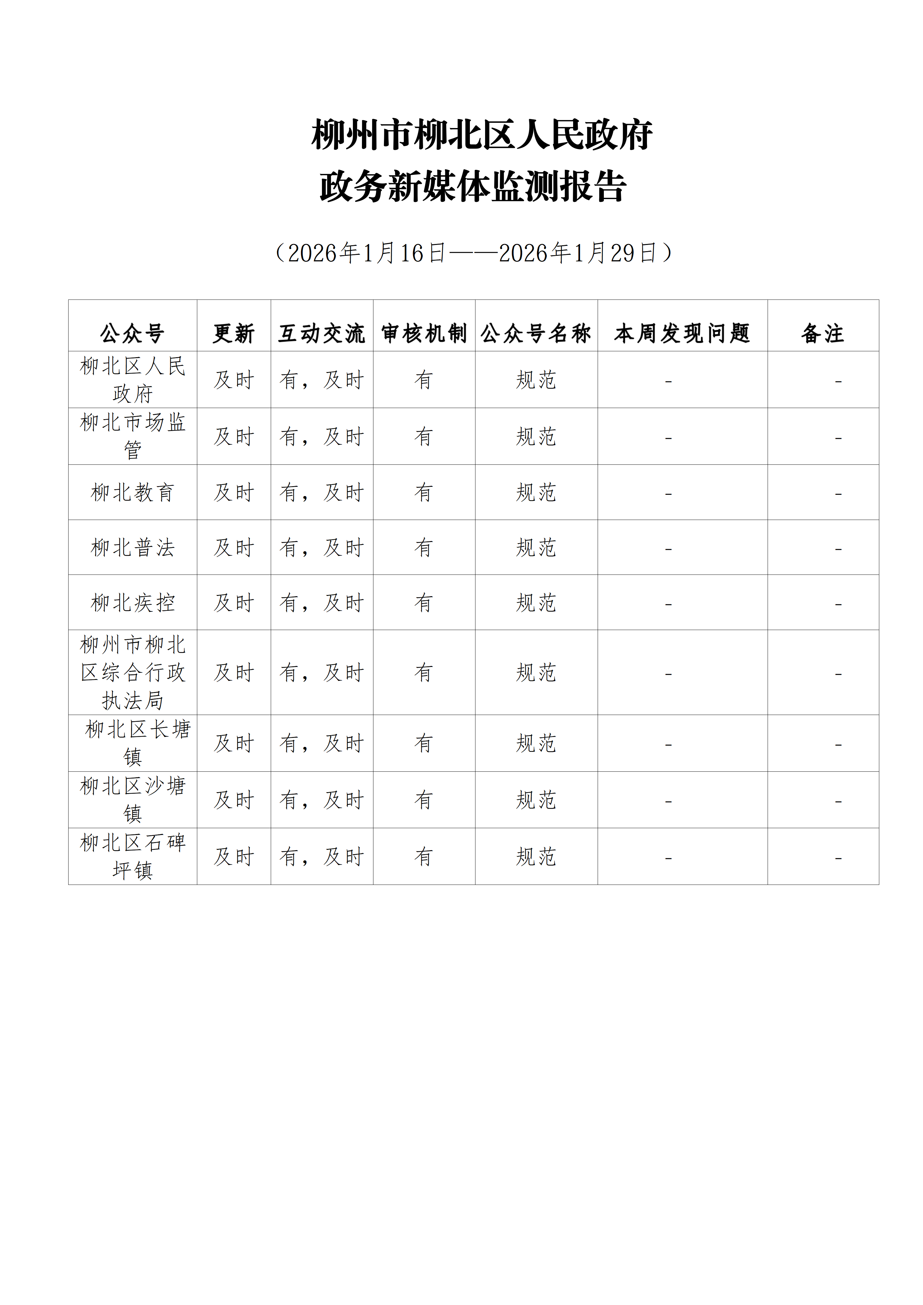 柳州市柳北区2026年1月份政务新媒体周监测情况