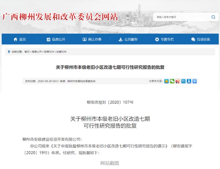 近日,柳州市发展和改革委员会网站发布了柳州市本级老旧小区改造七期、八期项目建议书、可行性研究报告的批复,改造的片区有鱼峰区水南片区、柳北区雀儿山路5号。改造后,这些老旧小区居民的居住条件和生活环境将得到改善。