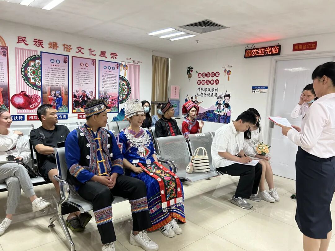 在七夕节当天,结合苗族传统习俗,组织开展形式多样的特色颁证活动,为新人开展情感咨询,宣传婚姻登记法律法规,发放“倡导文明婚俗、弘扬时代新风”倡议书,并为结婚登记新人举行颁证仪式。