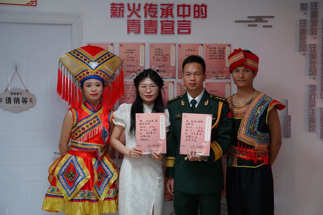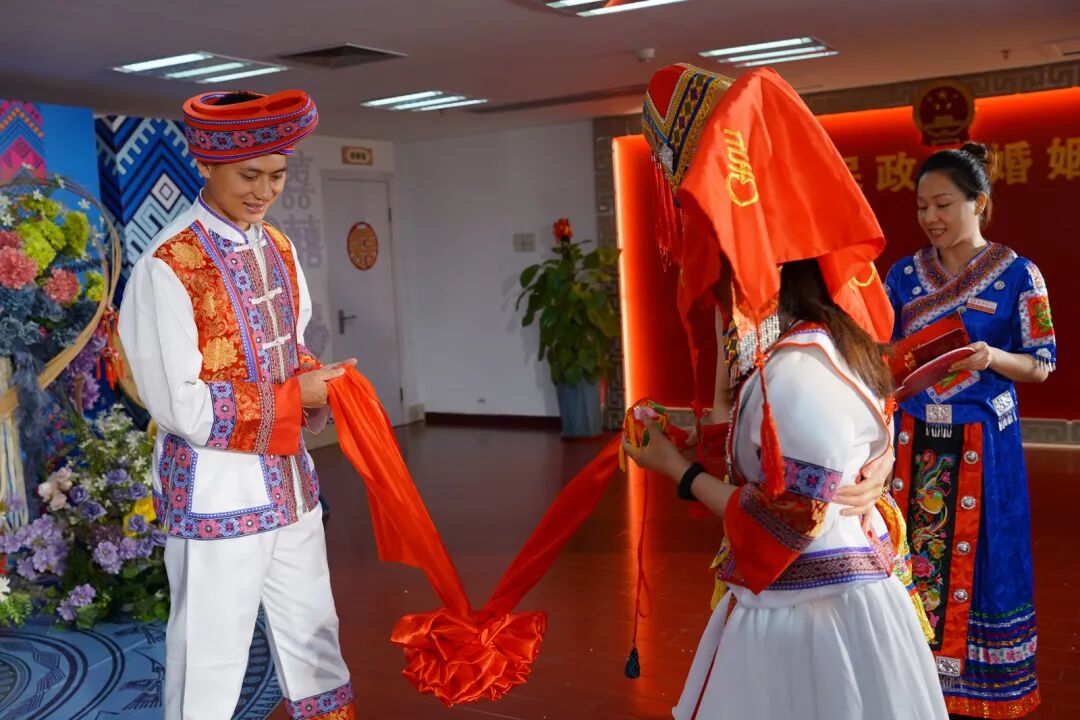 柳北区融合各民族婚俗服装、婚俗游戏、双语颁证等形式来体现民族婚俗的元素。新人身着民族服装,以歌曲为背景,在庄严的国徽下,宣读结婚誓言,颁发结婚证书,双方交换信物,最后一起共饮交杯茶欢庆新人喜结连理。同时开展“婚前小课堂”“家风家训”“婚育新风”等文化宣传,进一步引导新人们建立正确的婚姻家庭价值取向,树立社会主义文明婚姻新风尚。