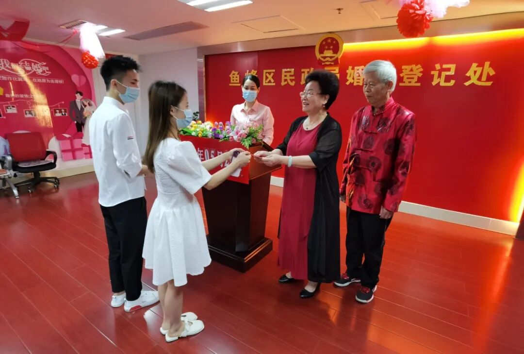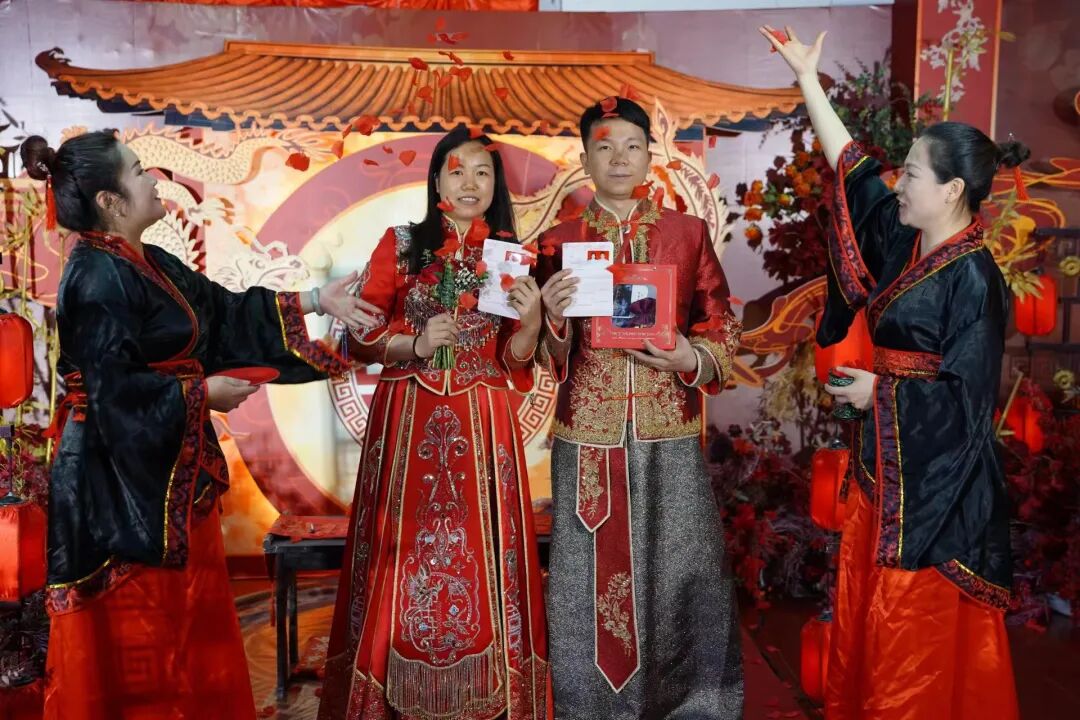 在颁证厅内设置弘扬中华民族传统文化家风家训展示墙、七夕节特色展板供新人观看。邀请金婚夫妻为新人颁证,送上祝福。