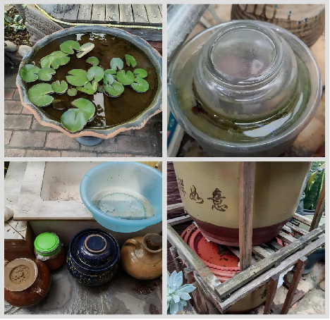(三)天台、阳台及门前屋后积水管理。屋顶反墚、排水槽等应定期疏通,避免堵塞积水。阳台、天台、庭院内的花盆、泡沫箱、废弃瓶罐等容器应及时清理,闲置容器应倒扣放置,储水容器如水缸应加盖,废弃容器彻底清除。竹筒、树洞应进行封堵或改造,莲花池养鱼防蚊。空调冷凝水应及时排净,废弃轮胎在底部打孔或避免露天放置。下水井进行防蚊封堵,有条件的建议将明沟改为暗渠。