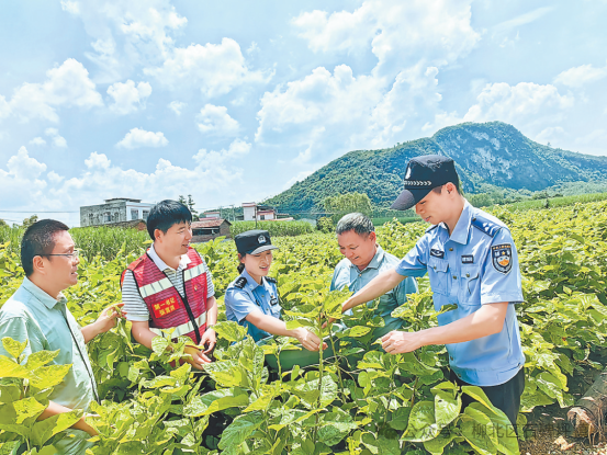 白露时节,和煦的阳光洒向大地,柳州市柳北区石碑坪镇新维村的千亩桑田显得更加青翠。9月18日上午,当柳州市公安局石碑坪派出所副所长谢丹丹和驻新维村第一书记张言洪等人刚到新维村长畲屯的路口时,正在桑树地里摘桑叶的村民谢汉强便热情地打招呼。谢丹丹和张言洪下到桑田,与谢汉强一起摘桑叶、拉家常,警民关系融洽。