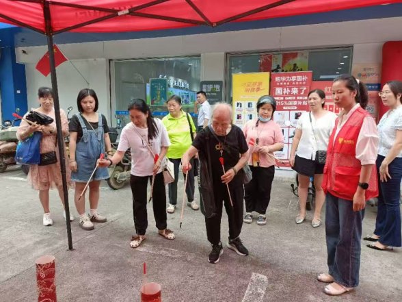 民族团结融活动,趣味互动传情谊。在投壶趣味游戏区,少数民族居民樊阿姨带着孙子率先参与投壶活动,她手持箭矢,瞄准壶口,稳稳投中,引得周围居民阵阵喝彩声。不一会儿,参加了投壶活动的居民们手中都堆满了牙膏、洗洁精等奖品。