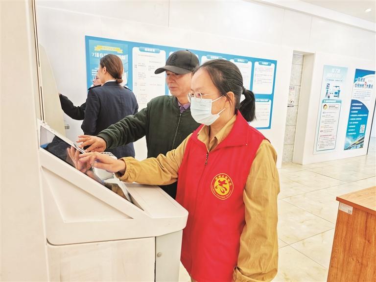 城中区办税服务大厅内,流动导税员帮助市民在自助服务机上办理社保业务。