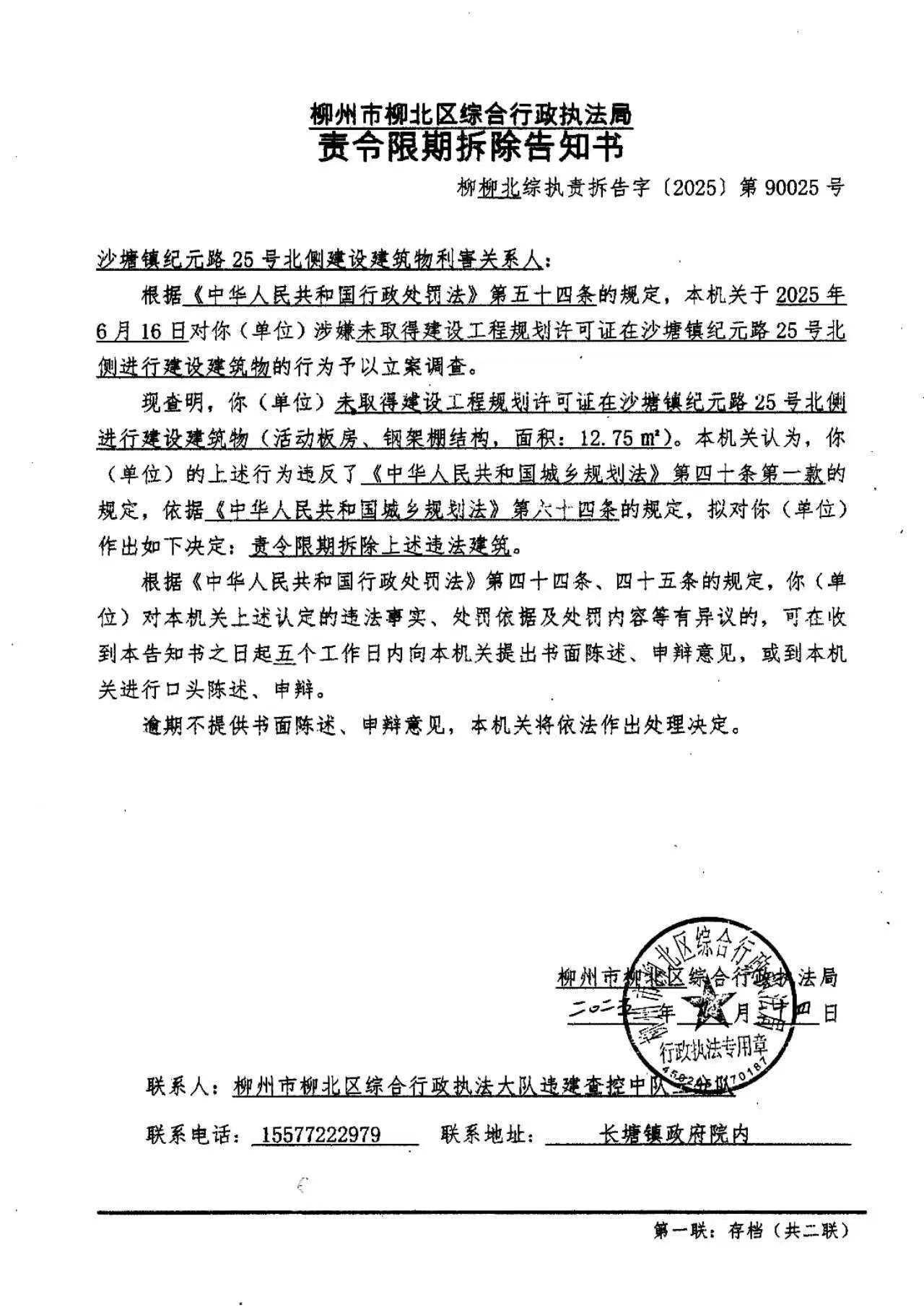 2025年9月24日,柳州市柳北区综合行政执法局依法作出《责令限期拆除告知书》(柳柳北综执责拆告字〔2025〕第90025号)。因利害关系人不详无法采取其他方式送达,为确保当事人的合法权益,根据《中华人民共和国民事诉讼法》第九十五条第一款,《中华人民共和国行政处罚法》第六十一条第一款,《住房和城乡建设行政处罚程序规定》第三十六条第二款之规定现向沙塘镇纪元路25号北侧建设建筑物利害关系人公告送达《责令限期拆除告知书》(柳柳北综执责拆告字〔2025〕第90025号),公告期为三十日,公告期满即视为送达。