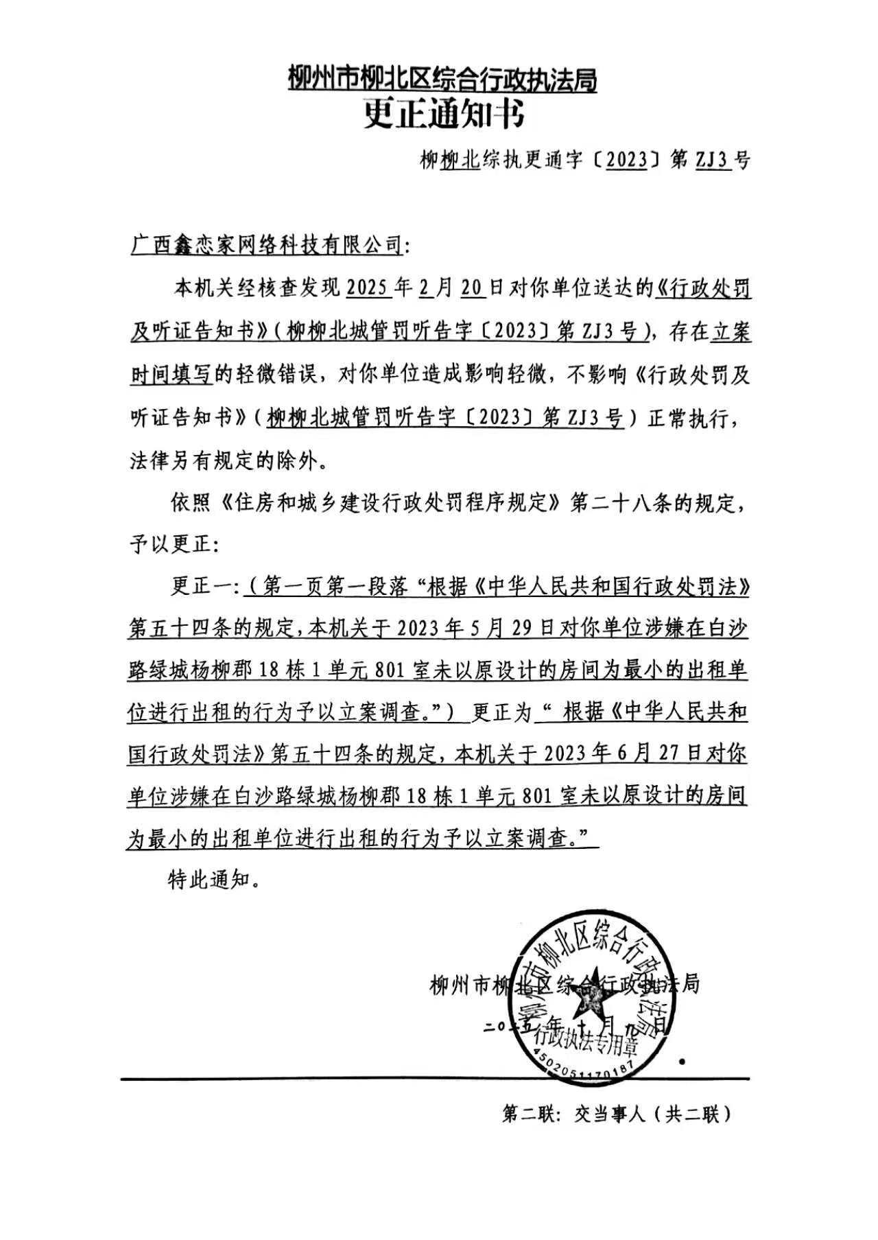 2025年10月9日,柳州市柳北区综合行政执法局依法作出《更正通知书》(柳柳北综执更通字〔2023〕第ZJ3号)。因当事人广西鑫恋家网络科技有限公司的经营地址已经撤销且本机关联系该公司法人姚积华尝试进行邮寄送达或者电子送达时,该公司法人姚积华采取提供无效地址、刻意回避以及拒接电话等形式躲避送达,导致本机关无法以直接送达、留置送达、邮寄送达等方式向当事人广西鑫恋家网络科技有限公司进行送达。为确保当事人的合法权益,根据《中华人民共和国民事诉讼法》第九十五条第一款,《中华人民共和国行政处罚法》第六十一条第一款,《住房和城乡建设行政处罚程序规定》第三十六条第二款之规定向广西鑫恋家网络科技有限公司公告送达《更正通知书》(柳柳北综执更通字〔2023〕第ZJ3号),请广西鑫恋家网络科技有限公司自本公告发布之日起30日内,前往本机关领取上述文书,逾期则视为送达。
