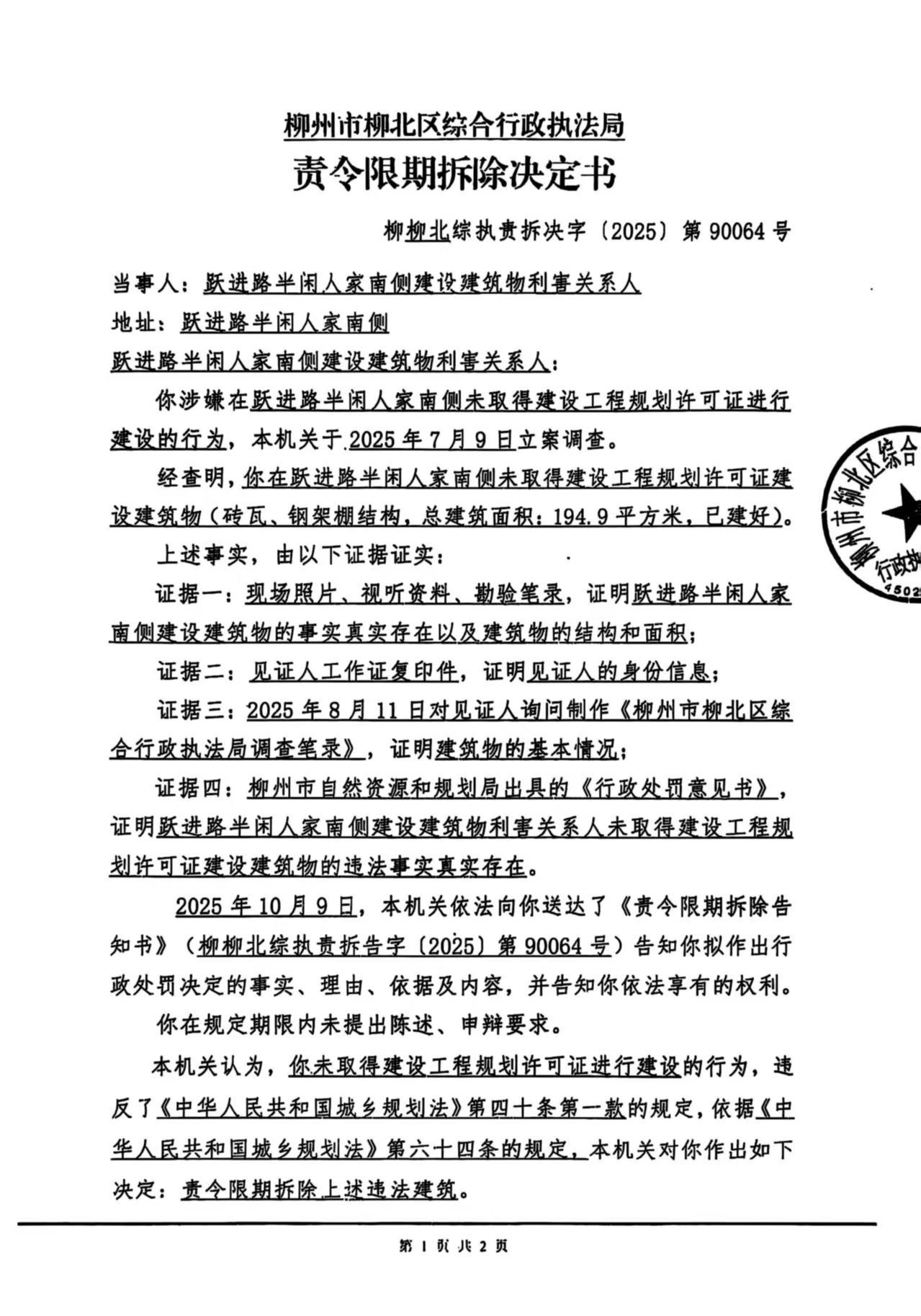 2025年10月20日,柳州市柳北区综合行政执法局依法作出《责令限期拆除决定书》(柳柳北综执责拆决字〔2025〕第90064号)。因利害关系人不详无法采取其他方式送达,为确保利害关系人的合法权益,根据《中华人民共和国民事诉讼法》第九十五条第一款,《中华人民共和国行政处罚法》第六十一条第一款,《住房和城乡建设行政处罚程序规定》第三十六条第二款之规定向跃进路半闲人家南侧建设建筑物利害关系人公告送达《责令限期拆除决定书》(柳柳北综执责拆决字〔2025〕第90064号),公告期为三十日,公告期满即视为送达。