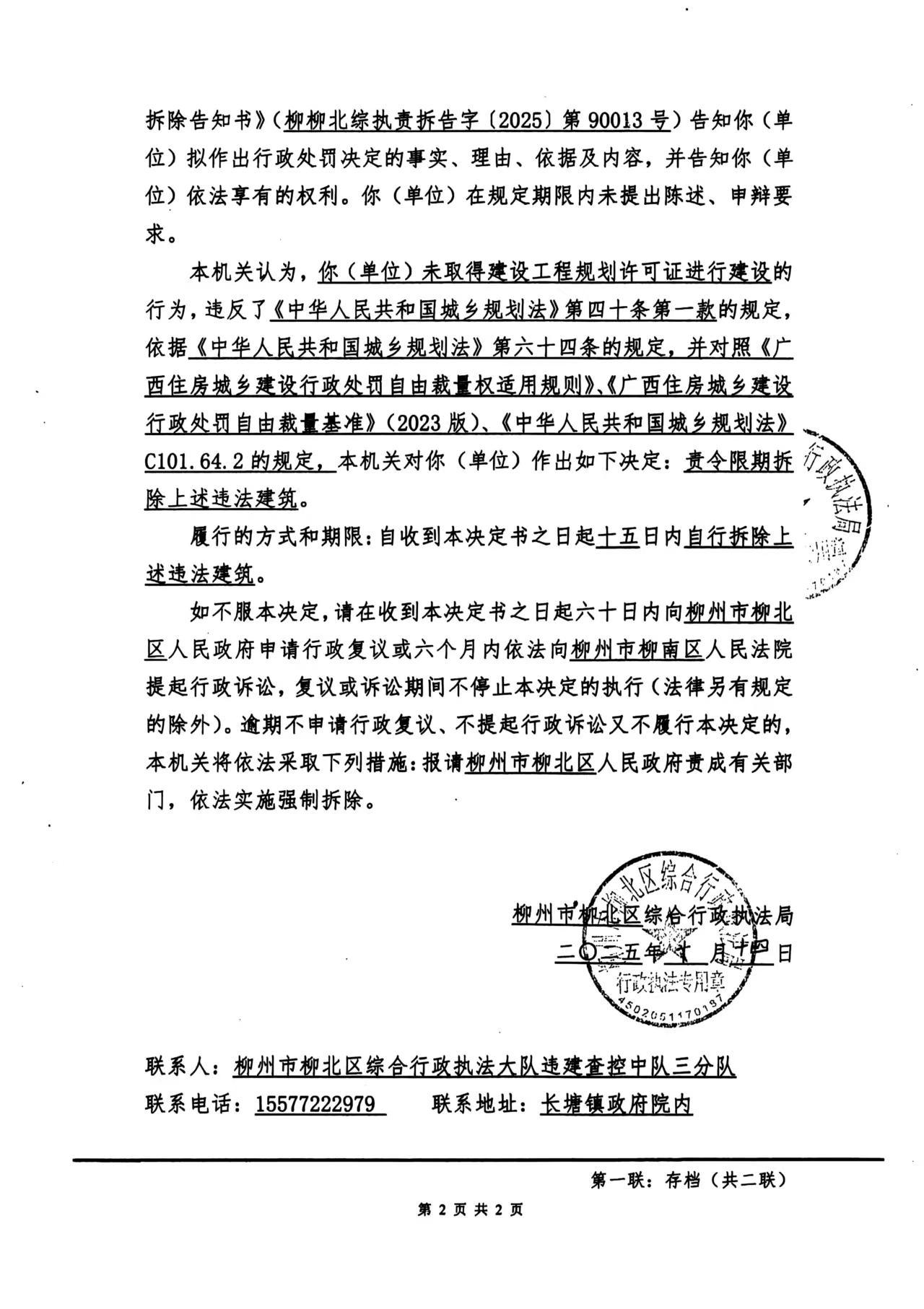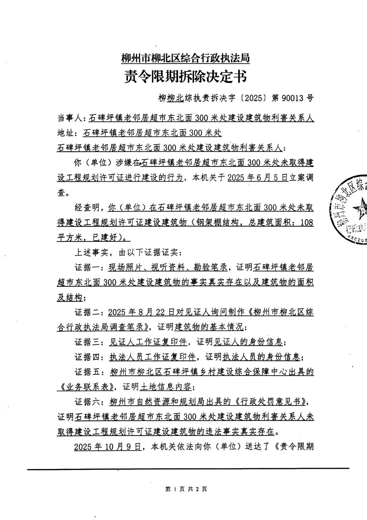 2025年10月14日,柳州市柳北区综合行政执法局依法作出《责令限期拆除决定书》(柳柳北综执责拆决字〔2025〕第90013号)。因利害关系人不详无法采取其他方式送达,为确保当事人的合法权益,根据《中华人民共和国民事诉讼法》第九十五条第一款,《中华人民共和国行政处罚法》第六十一条第一款,《住房和城乡建设行政处罚程序规定》第三十六条第二款之规定现向石碑坪镇老邻居超市东北面300米处建设建筑物利害关系人公告送达《责令限期拆除决定书》(柳柳北综执责拆决字〔2025〕第90013号),公告期为三十日,公告期满即视为送达。