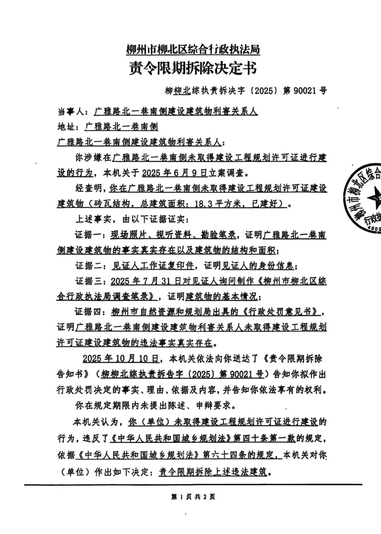 2025年10月20日,柳州市柳北区综合行政执法局依法作出《责令限期拆除决定书》(柳柳北综执责拆决字〔2025〕第90021号)。因利害关系人不详无法采取其他方式送达,为确保利害关系人的合法权益,根据《中华人民共和国民事诉讼法》第九十五条第一款,《中华人民共和国行政处罚法》第六十一条第一款,《住房和城乡建设行政处罚程序规定》第三十六条第二款之规定向广雅路北一巷南侧建设建筑物利害关系人公告送达《责令限期拆除决定书》(柳柳北综执责拆决字〔2025〕第90021号),公告期为三十日,公告期满即视为送达。