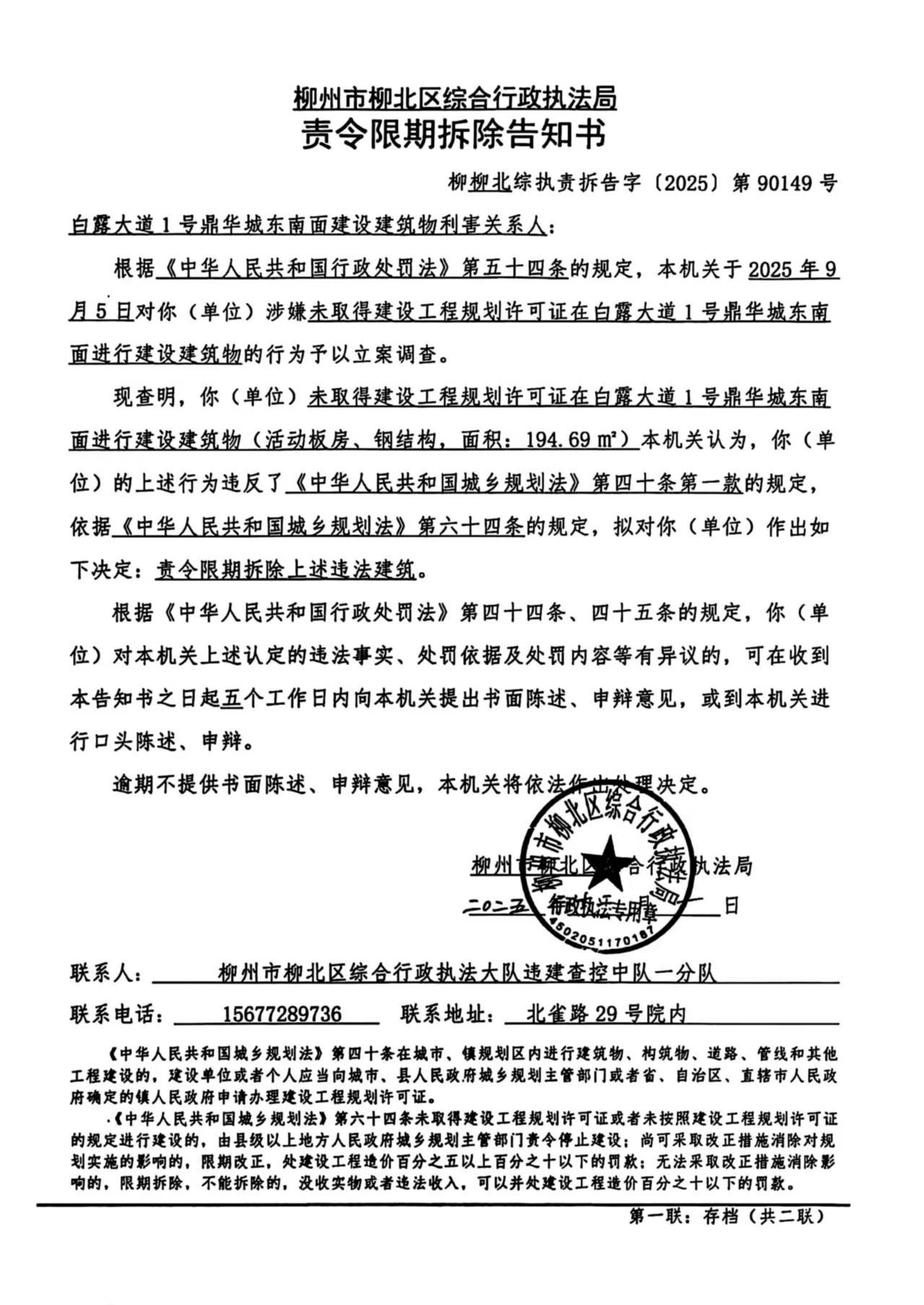 2025年12月1日,柳州市柳北区综合行政执法局依法作出《责令限期拆除告知书》(柳柳北综执责拆告字〔2025〕第90149号)。因利害关系人不详无法采取其他方式送达,为确保当事人的合法权益,根据《中华人民共和国民事诉讼法》第九十五条第一款,《中华人民共和国行政处罚法》第六十一条第一款,《住房和城乡建设行政处罚程序规定》第三十六条第二款之规定现向白露大道1号鼎华城东南面建设建筑物利害关系人公告送达《责令限期拆除告知书》(柳柳北综执责拆告字〔2025〕第90149号),公告期为三十日,公告期满即视为送达。