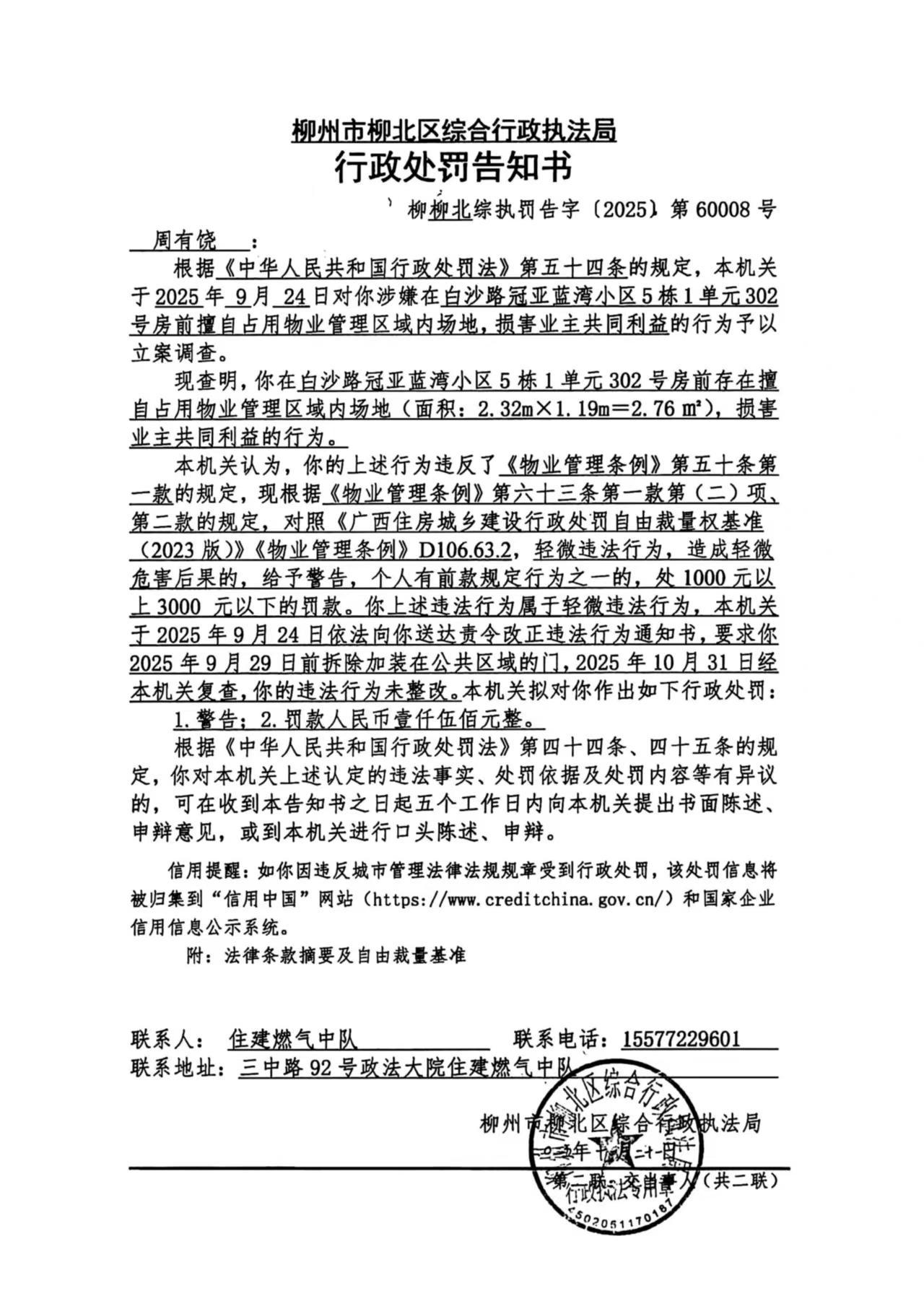2025年11月21日,柳州市柳北区综合行政执法局依法作出《行政处罚告知书》(柳柳北综执罚告字〔2025〕第60008号)。因本机关电话无法联系到你,且以邮寄方式进行送达遭到拒收。本机关从2025年11月21日至11月28日多次电话联系你均未接通。因你采取刻意回避以及拒接电话等形式躲避送达,导致本机关无法以直接送达、留置送达、邮寄送达等方式向你进行送达。为确保你的合法权益,根据《中华人民共和国民事诉讼法》第九十五条第一款,《中华人民共和国行政处罚法》第六十一条第一款,《住房和城乡建设行政处罚程序规定》第三十六条第三款之规定向你公告送达《行政处罚告知书》(柳柳北综执罚告字〔2025〕第60008号),请你自本公告发布之日起30日内,前往本机关领取上述文书,逾期则视为送达。
