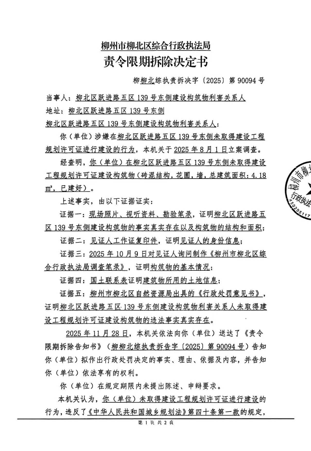 2025年12月9日,柳州市柳北区综合行政执法局依法作出《责令限期拆除决定书》(柳柳北综执责拆决字〔2025〕第90094号)。因利害关系人不详无法采取其他方式送达,为确保利害关系人的合法权益,根据《中华人民共和国民事诉讼法》第九十五条第一款,《中华人民共和国行政处罚法》第六十一条第一款,《住房和城乡建设行政处罚程序规定》第三十六条第二款之规定向柳北区跃进路五区139号东侧建设构筑物利害关系人公告送达《责令限期拆除决定书》(柳柳北综执责拆决字〔2025〕第90094号),公告期为三十日,公告期满即视为送达。