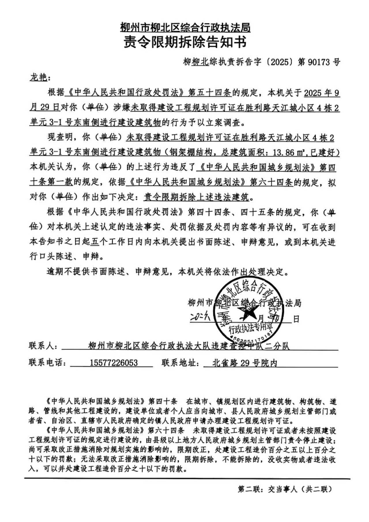 2026年1月9日,柳州市柳北区综合行政执法局依法作出《责令限期拆除告知书》(柳柳北综执责拆告字〔2025〕第90173号)。本机关于2026年1月9日多次通过电话联系你,因你采取刻意回避的形式躲避送达,导致本机关无法以直接送达、留置送达、邮寄送达等方式向你进行送达。为确保当事人的合法权益,根据《中华人民共和国民事诉讼法》第九十五条第一款,《中华人民共和国行政处罚法》第六十一条第一款,《住房和城乡建设行政处罚程序规定》第三十六条第二款之规定向龙艳公告送达《责令限期拆除告知书》(柳柳北综执责拆告字〔2025〕第90173号),公告期为三十日,公告期满即视为送达。