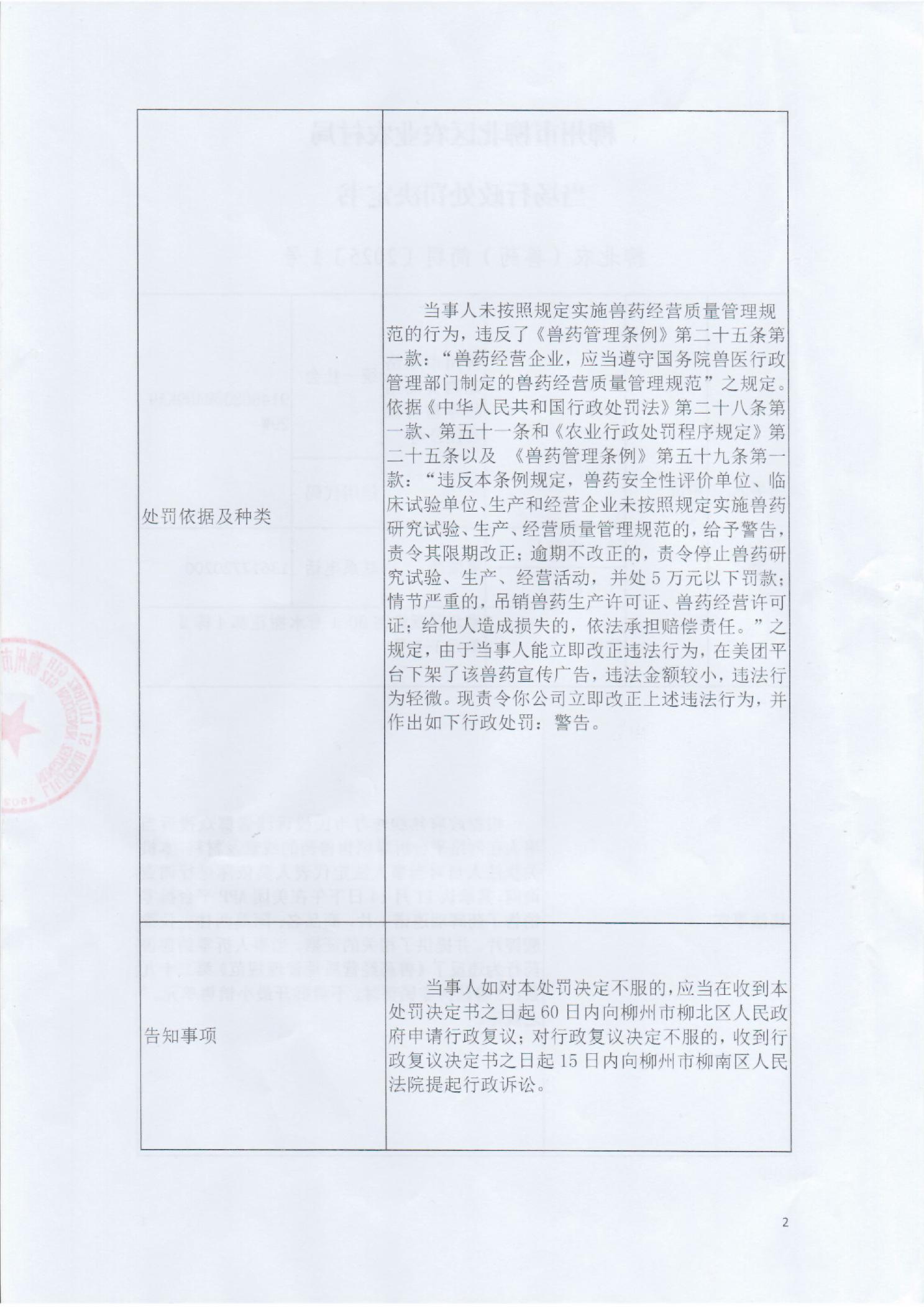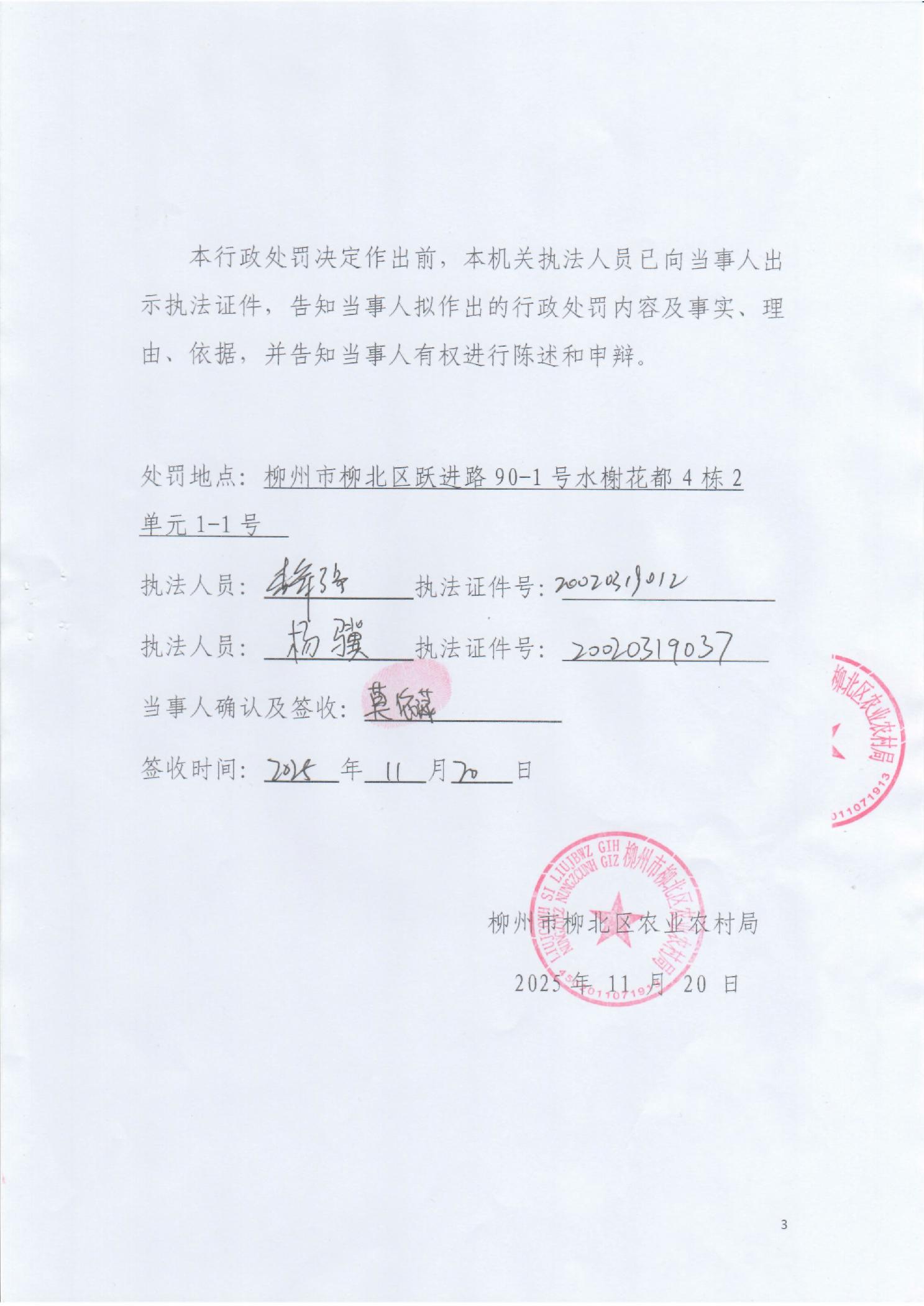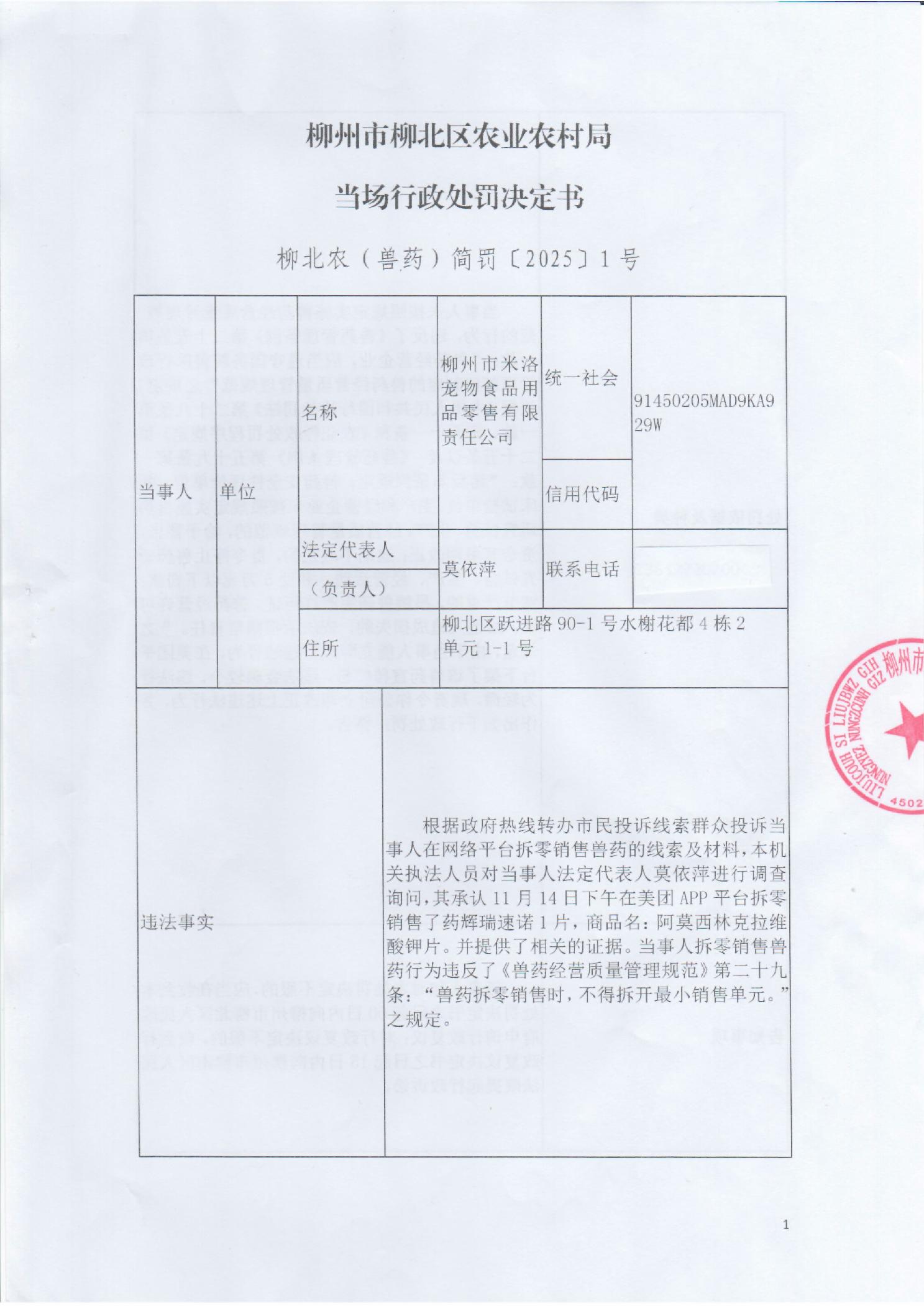 柳北区农业农村局当场行政处罚决定书{柳北农(兽药)简罚〔2025〕1号}