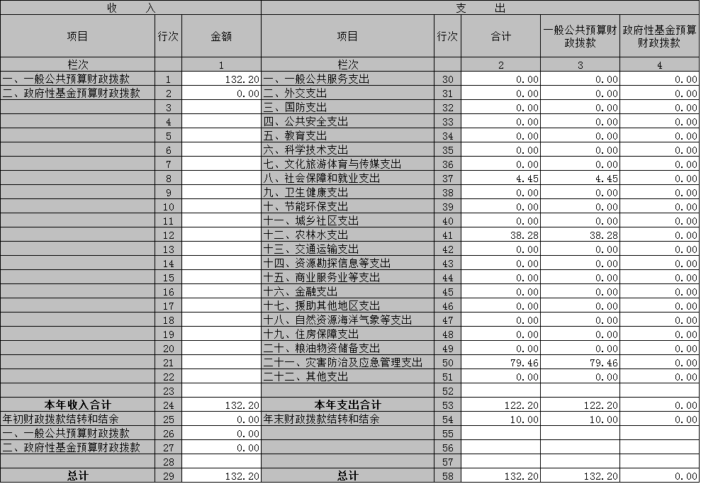本部门2019年度财政拨款收、支总决算132.20万、132.20万元。与2018年相比,财政拨款收、支总计各增加39.58万元,增长42.73%。