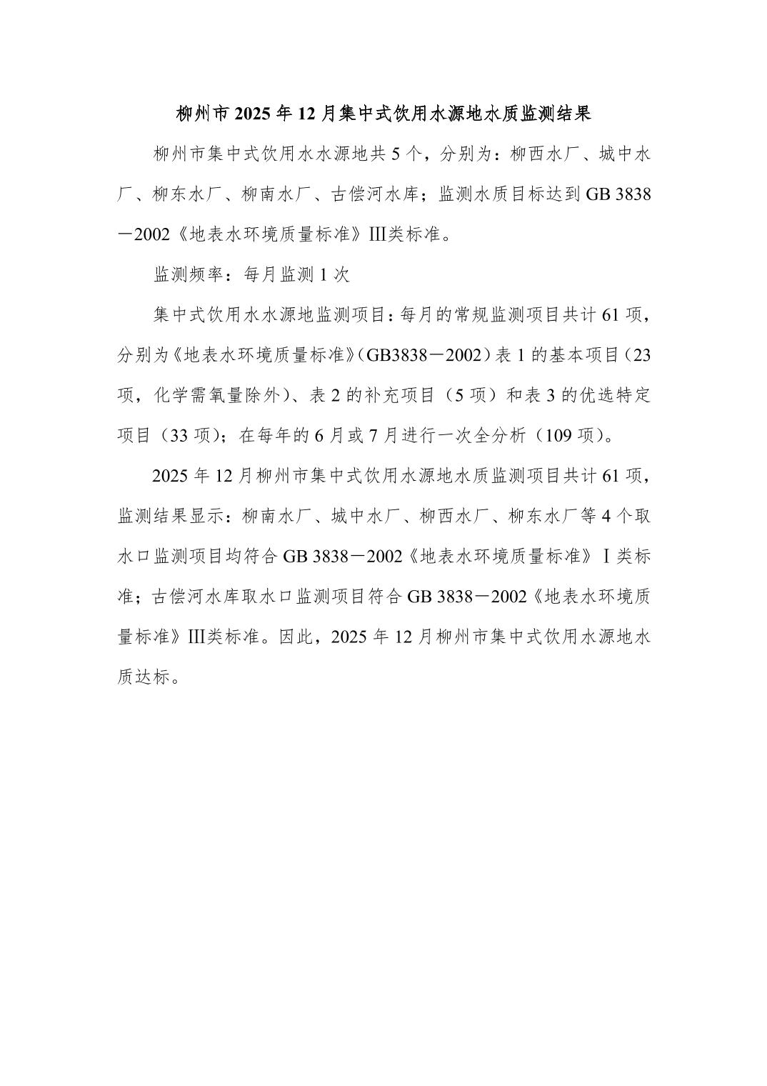 2025年12月份柳州市市级饮用水质量报告