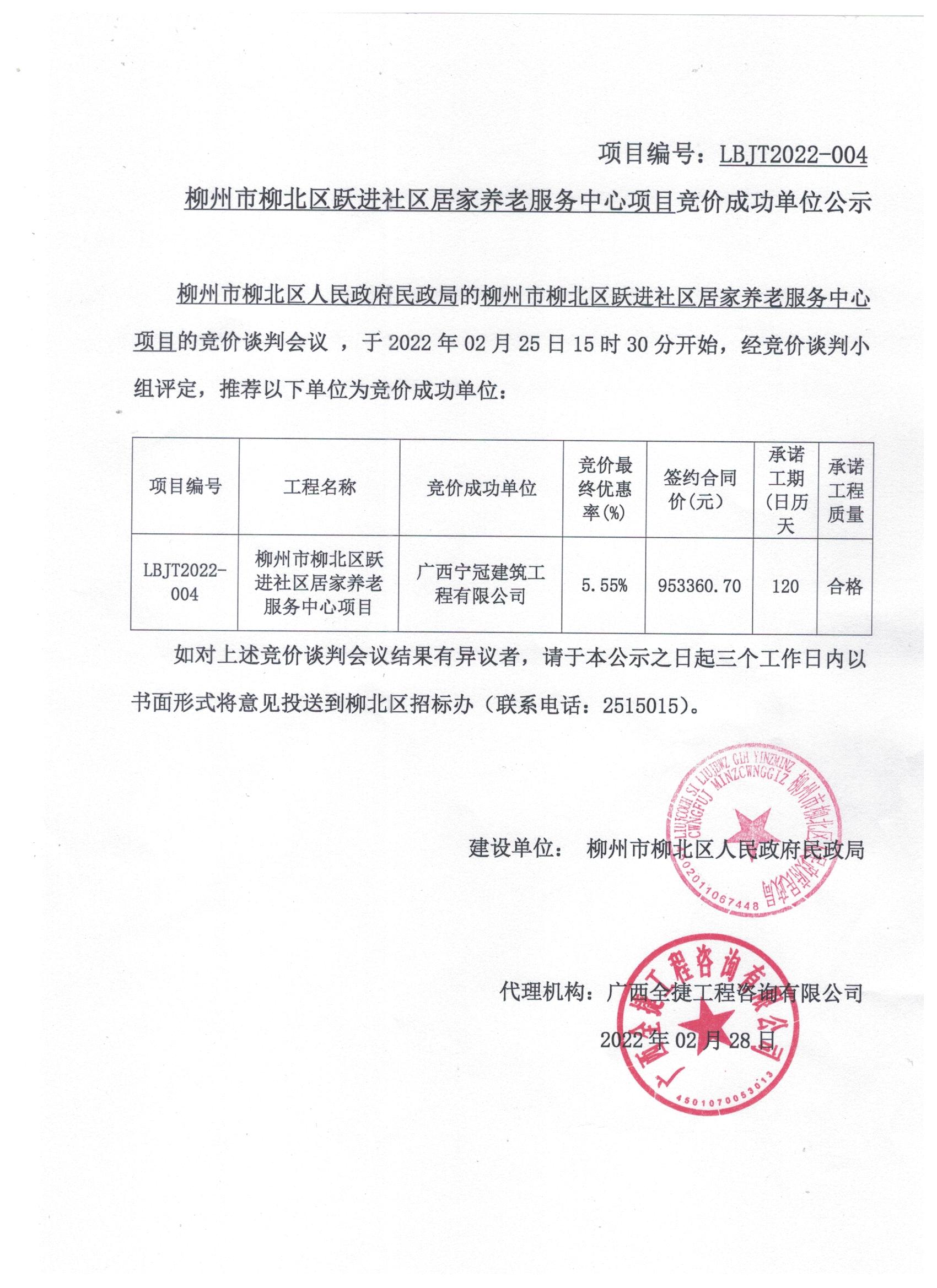 LBJT2022-004 柳州市柳北区跃进社区居家养老服务中心竞价成功单位公示