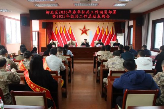 1月15日,柳北区召开2026年春季征兵工作动员部署会。会议表彰城区征兵工作先进单位、先进个人,总结2025年征兵工作情况,部署了2026年上半年征兵工作任务。区委副书记、区长、区征兵工作领导小组组长洪进兴,区征兵工作领导小组副组长、征兵办主任马小龙,区委常委、区人武部袁进东,区委常委、副区长、区征兵工作领导小组副组长李春帆出席会议。