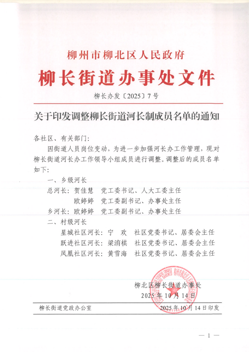 柳长办发〔2025〕7号 关于印发《调整柳长街道河长制成员名单》的通知